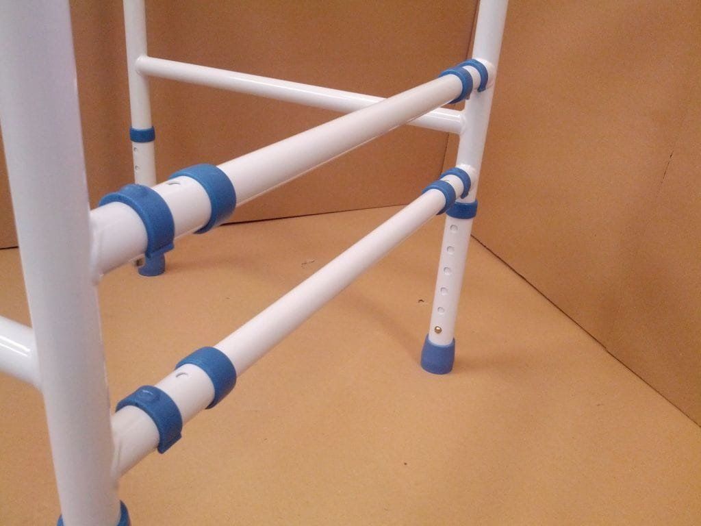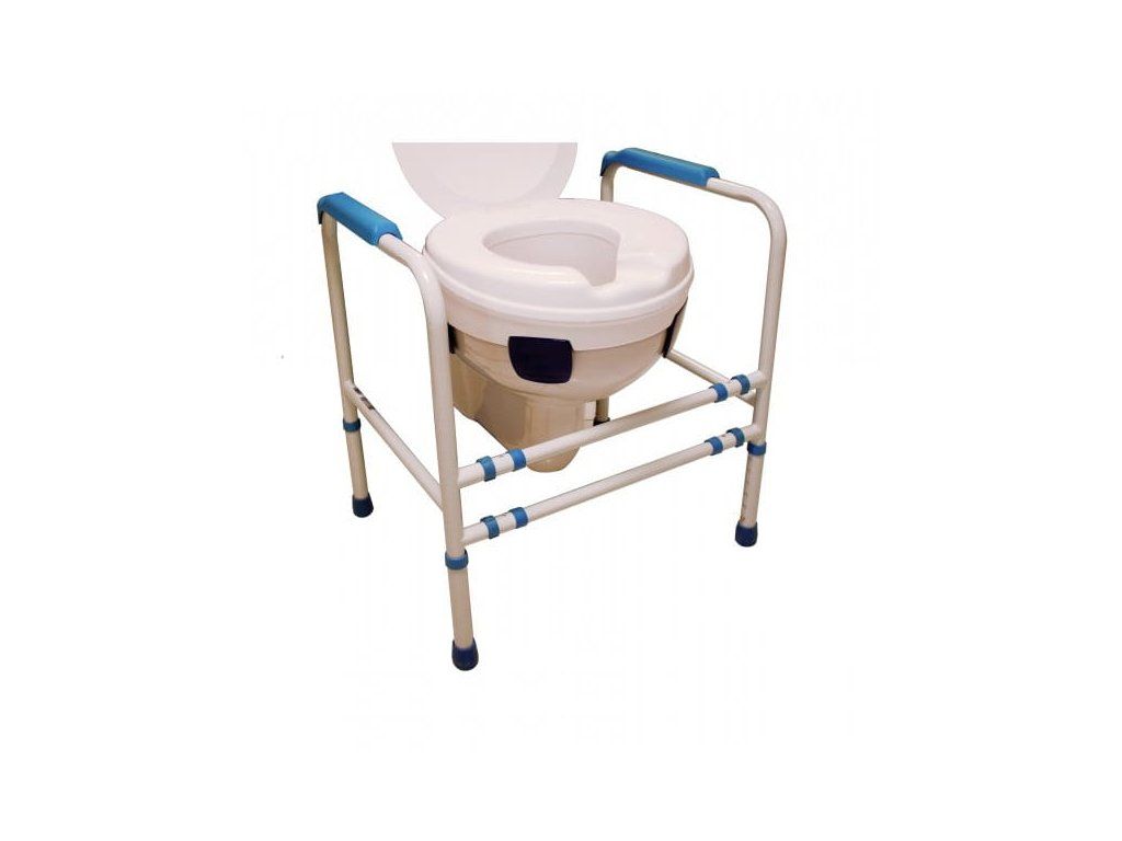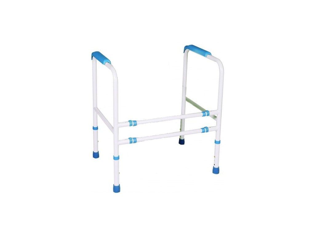 Konstrukce se 4 nohami zajišťuje velmi dobrou stabilitu. Díky nastavitelné výšce a šířce lze rám přizpůsobit různým rozměrům toalety i potřebám uživatele. Lehký, ale odolný hliníkový rám je doplněn o praktické područky z plastu v modré barvě. Povrchová úprava bílým práškovým lakem usnadňuje údržbu a přispívá k dlouhé životnosti.